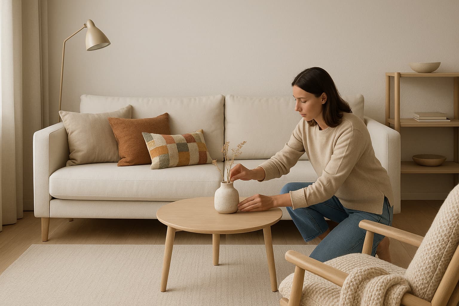 Подбирают текстиль, растения и аксессуары, создавая уютный и современный интерьер без перегрузки.